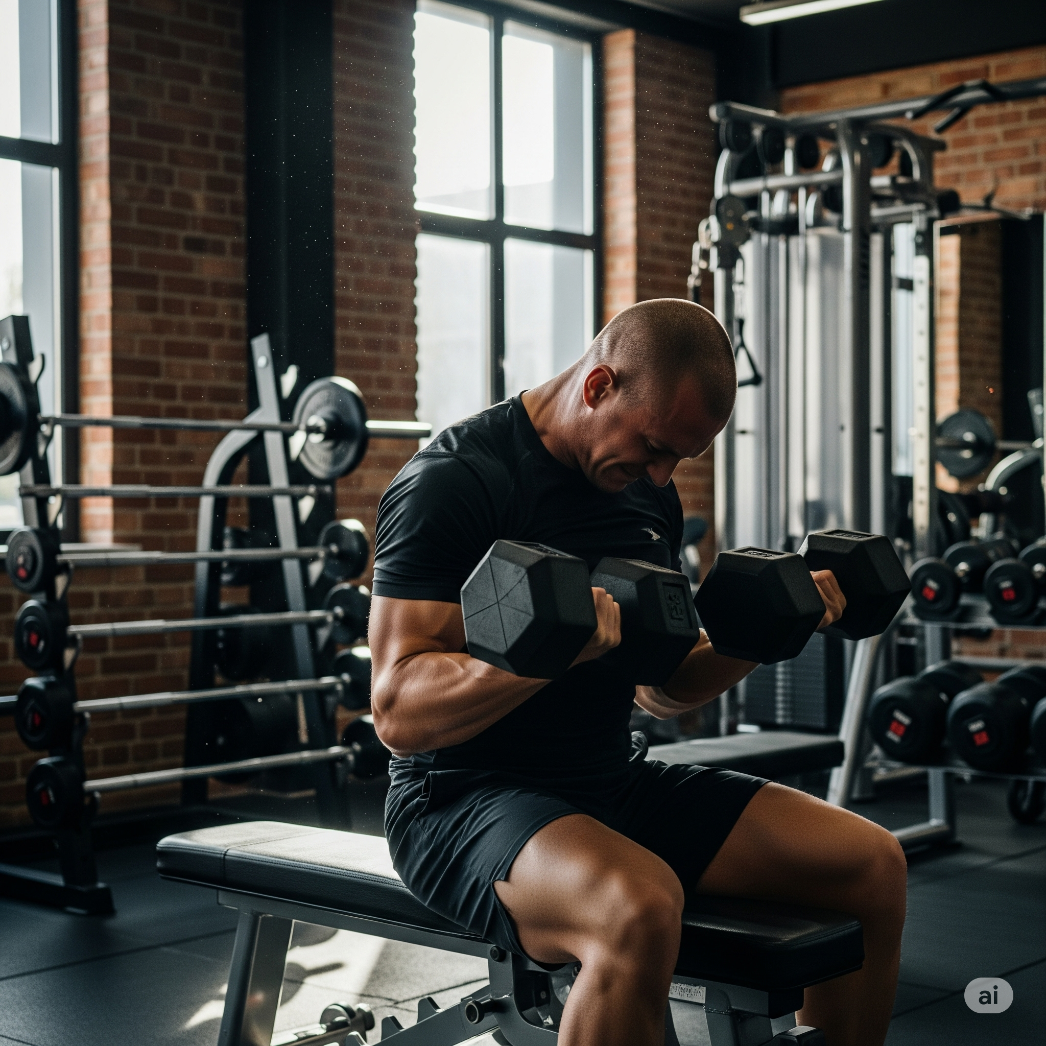 A man with a shaved head working out with dumbbells inside a gym with brick walls and large windows.